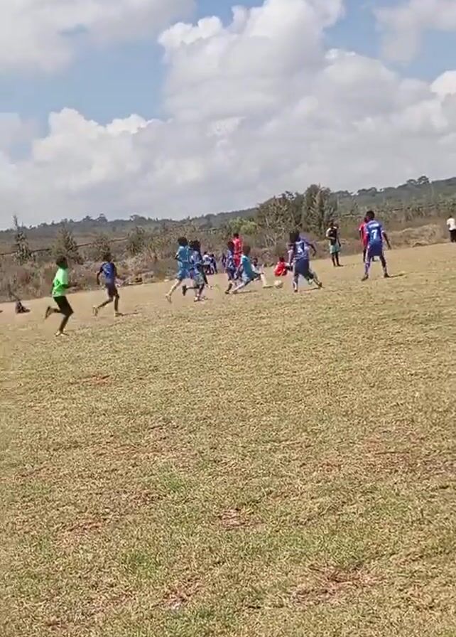 soccer match in progress on a grassy field. There are players wearing blue and red jerseys, spread across the field, actively engaged in the game. The sky is partly cloudy and the surrounding area includes trees and other vegetation. Some people are watching the game from the sidelines.