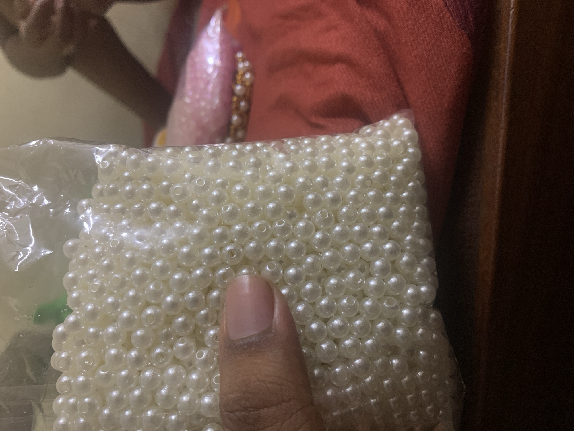 A close-up shot features a clear plastic bag filled with numerous small, white faux pearl beads