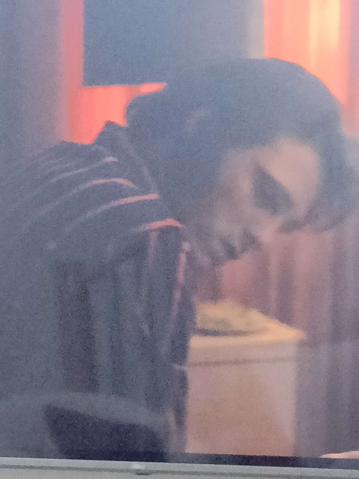 A blurry image shows a person wearing a striped shirt, looking down. The person has dark hair. Behind them, there are vertical red and orange elements, possibly curtains or lighting. A blurry, light-colored object, possibly a container, is partially visible. The image lacks details to determine a specific location.