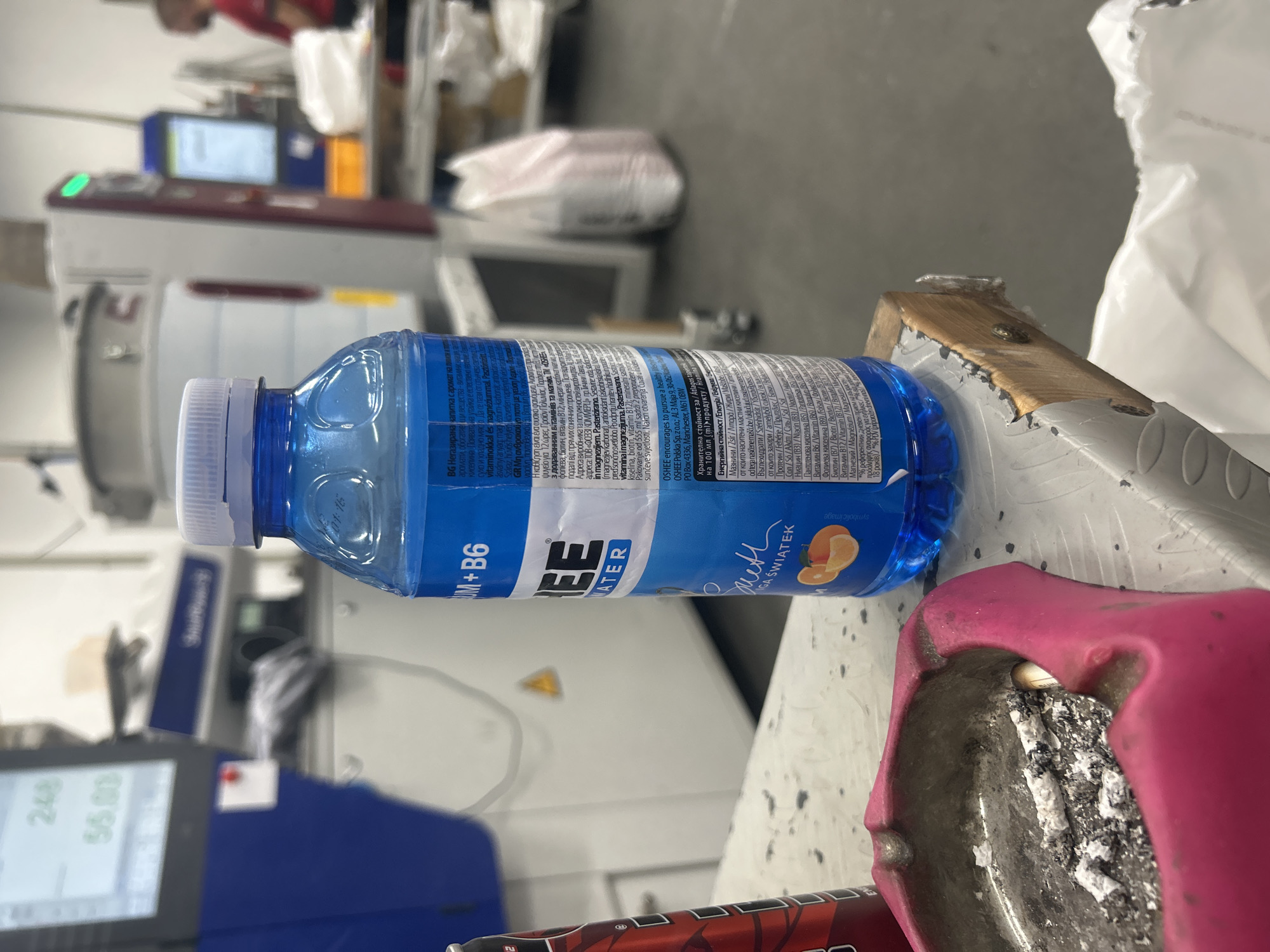 blue bottle of OSHEE Vitamin + B6 water, specifically the "Iga Swiatek" edition, lying on a surface next to a dirty pink ashtray containing cigarette butts and ashes. A red energy drink can is also partially visible. In the background, there is a blurred view of a room with equipment and machinery, possibly a factory or industrial setting. The focus is on the bottle and ashtray, with the background details being less clear.