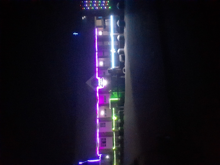 A nighttime scene shows a building adorned with colorful lights. A row of lights cascades down the building's side in hues of purple and green. Higher up, a section is decorated with a string of small multi-colored lights. To the right, the building's structure features white cylindrical elements illuminated by a blue glow. The overall atmosphere is dark, with the lights standing out against the night sky.