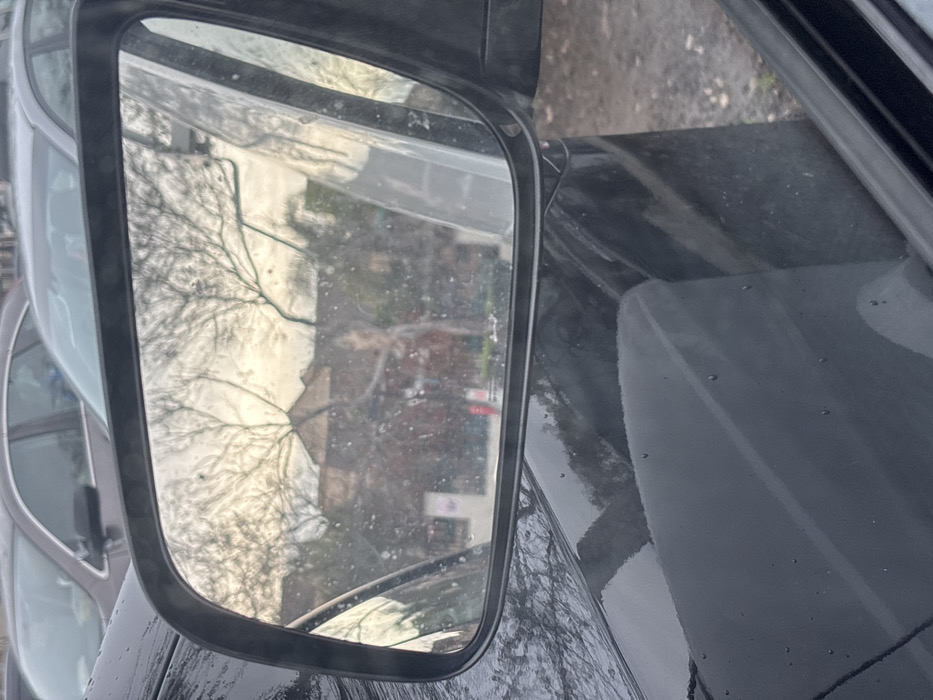 A car's side mirror reflects a building and bare tree branches. The mirror frame is black, and the reflective surface is speckled with water droplets. A portion of the car's hood, also black and wet, is visible on the right side of the frame. Another car is reflected adjacent to the side mirror.
