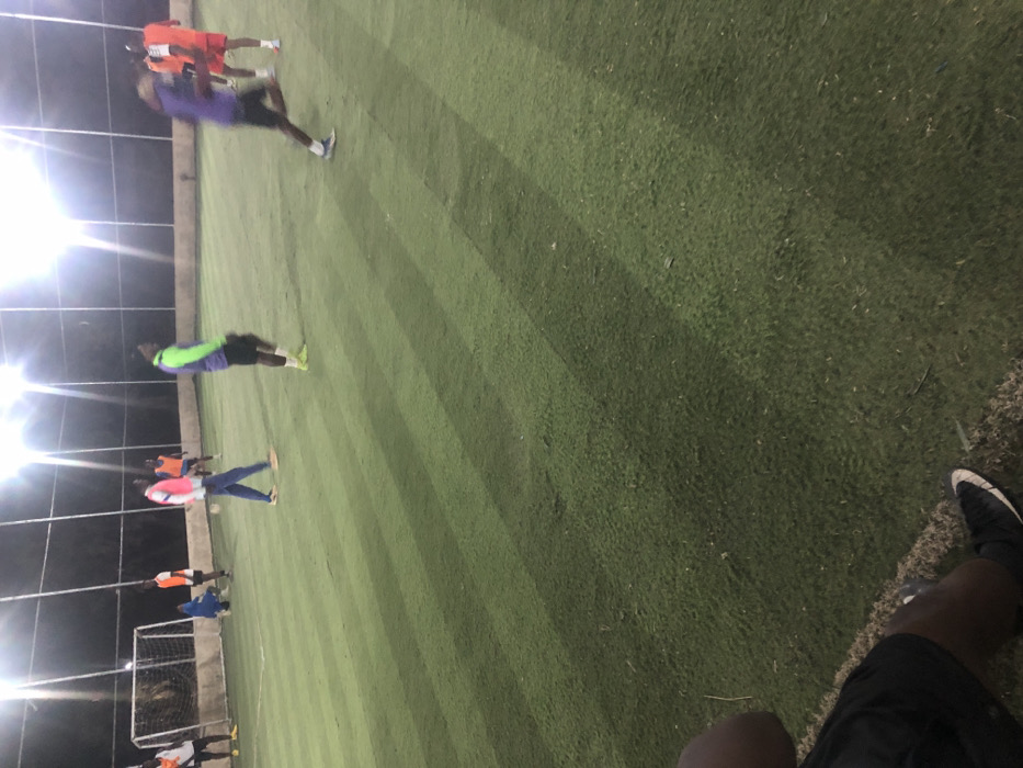 People play soccer on a green turf field at night. The field is well-lit with bright stadium lights along one edge. Several players wearing different colored jerseys run on the field. The view is from the edge of the field, showing a person's legs and shoes. The turf has artificial grass blades and white stripes.