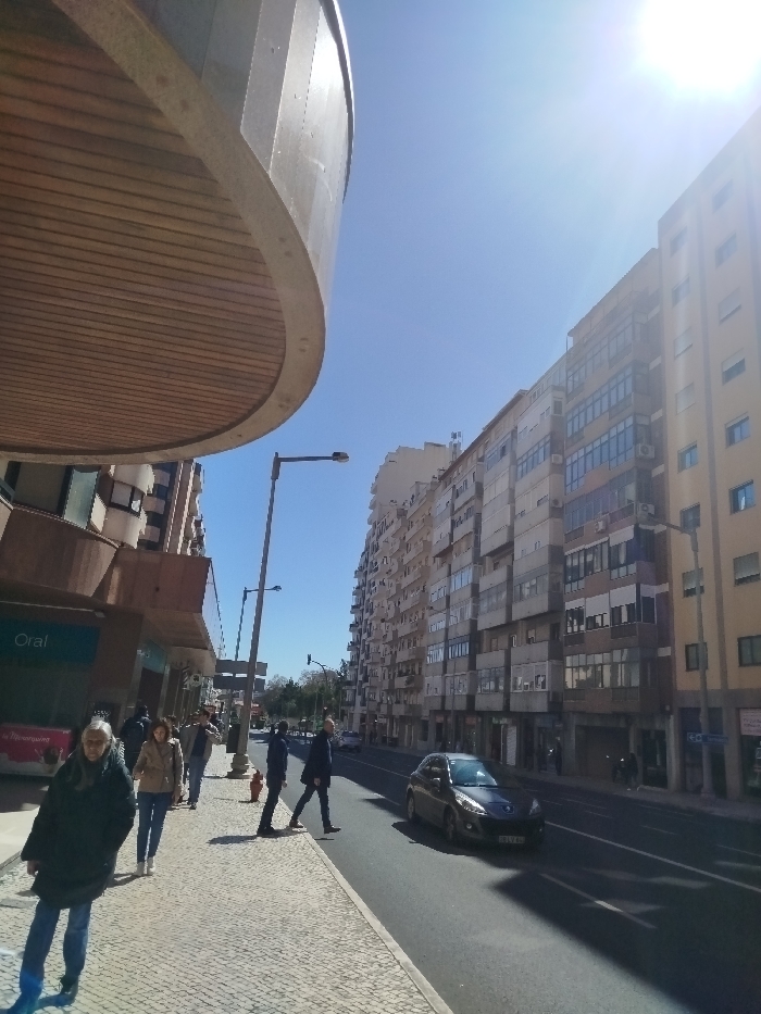 The image presents a daytime urban street scene in Lisbon, Portugal, captured under a clear blue sky with a significant sun flare in the upper right. The perspective is slightly low-angle, looking down a city street. In the immediate foreground, to the left, a large, curved architectural overhang with a dark exterior and a slatted light-colored wooden underside is prominently featured. Below this structure, a light-toned *calçada portuguesa* (Portuguese pavement) sidewalk is visible. Several pedestrians are on this sidewalk; one person in a dark coat and blue jeans walks towards the viewer, while two other individuals, one in a light jacket and blue jeans and another in dark clothing, walk away from the camera. A storefront with a blue sign displaying "Oral" and a partially visible pink poster below it is situated on the building facade to the left. Adjacent to the sidewalk is an asphalt road with visible lanes. A dark-colored hatchback vehicle is traveling away from the viewer in the right lane. Two male pedestrians, both in dark jackets and trousers, are actively crossing the street from the left sidewalk into the road. A tall, dark-colored street light pole stands near the curb on the left side of the road, with a red fire hydrant visible on the sidewalk behind the crossing pedestrians. Further down the street, additional street lights and traffic signals are discernible. The right side of the street is lined with a continuous row of multi-story buildings, appearing to be a mix of residential and commercial structures, featuring various window and balcony designs. Buildings also extend along the left side of the street beyond the foreground overhang. A tree-lined area or park is visible in the distant background at the end of the street.