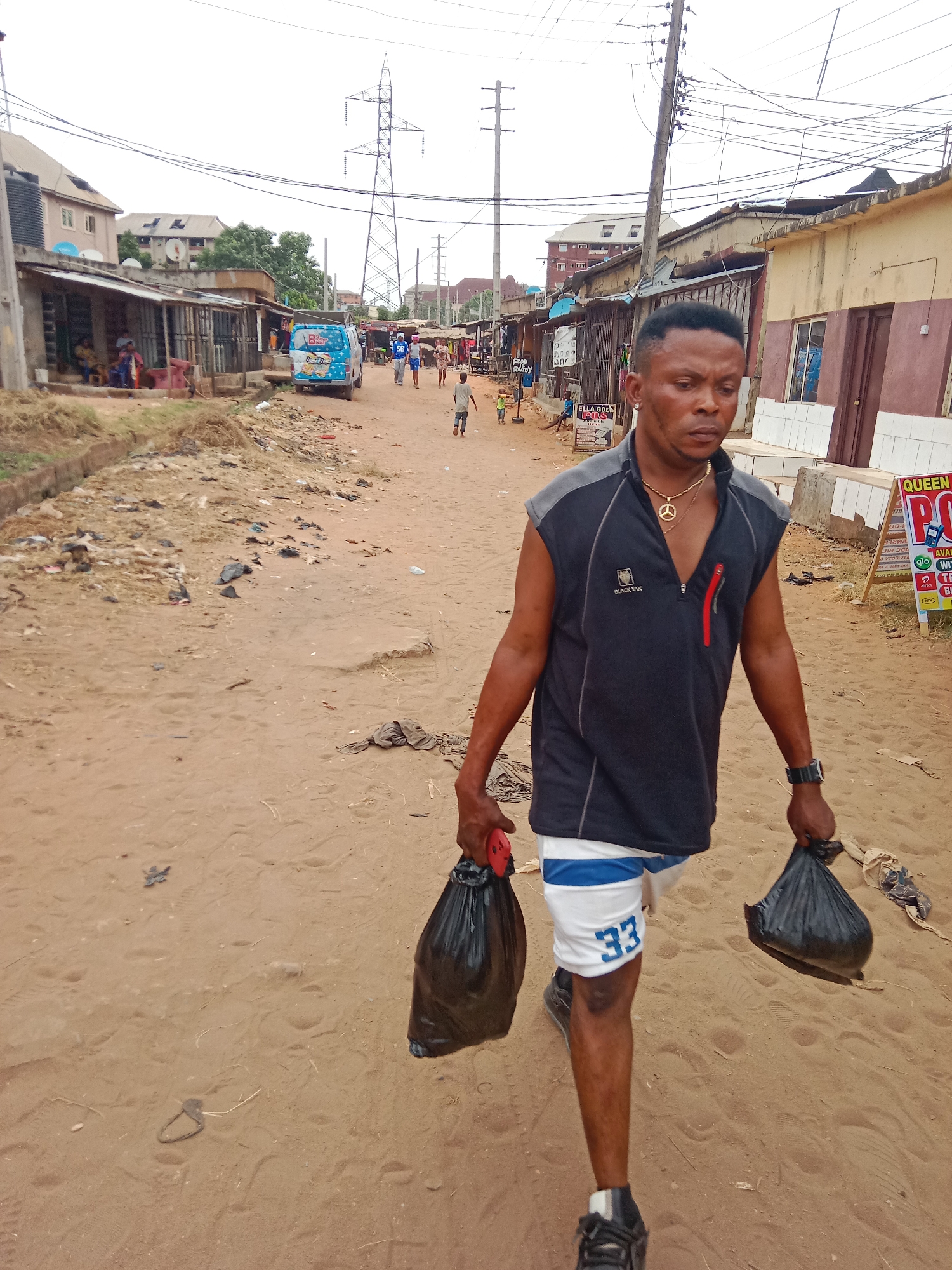 This image depicts an unpaved, sandy-dirt road in Onitsha, Nigeria, under an overcast sky. The foreground features an adult male, of dark complexion, walking towards the viewer from the right side of the frame. He wears a dark grey and black sleeveless collared shirt with a red zippered placket and a "Black Yak" logo, white shorts with blue stripes and the number "33," and dark athletic shoes. He has a gold-colored chain with a peace sign pendant, a silver-colored earring in his left ear, and a dark wristwatch on his left wrist. He carries a black plastic bag in each hand; the bag in his left hand has a red attachment. To the left of the road, a shallow ditch filled with debris runs parallel to the path. Beyond it, several single and multi-story buildings line the street, some with corrugated metal roofs. A group of individuals is seated outside one of these structures. Further down the road, a blue commercial van is parked. In the far distance, a large electrical transmission tower is visible against the horizon. On the right side of the road, additional buildings are present, displaying faded paint and commercial signage. One prominent sign, partially visible, reads "QUEEN OF PO..." with mobile network logos (Glo, Airtel, MTN) below, indicating a point of sale for telecommunication services. Another sign further back reads "ELLA GOD." Several utility poles with a dense network of overhead wires crisscross the sky. In the mid-ground, a child in a light-colored shirt walks away from the camera. The road itself shows foot impressions and scattered small pieces of refuse.
