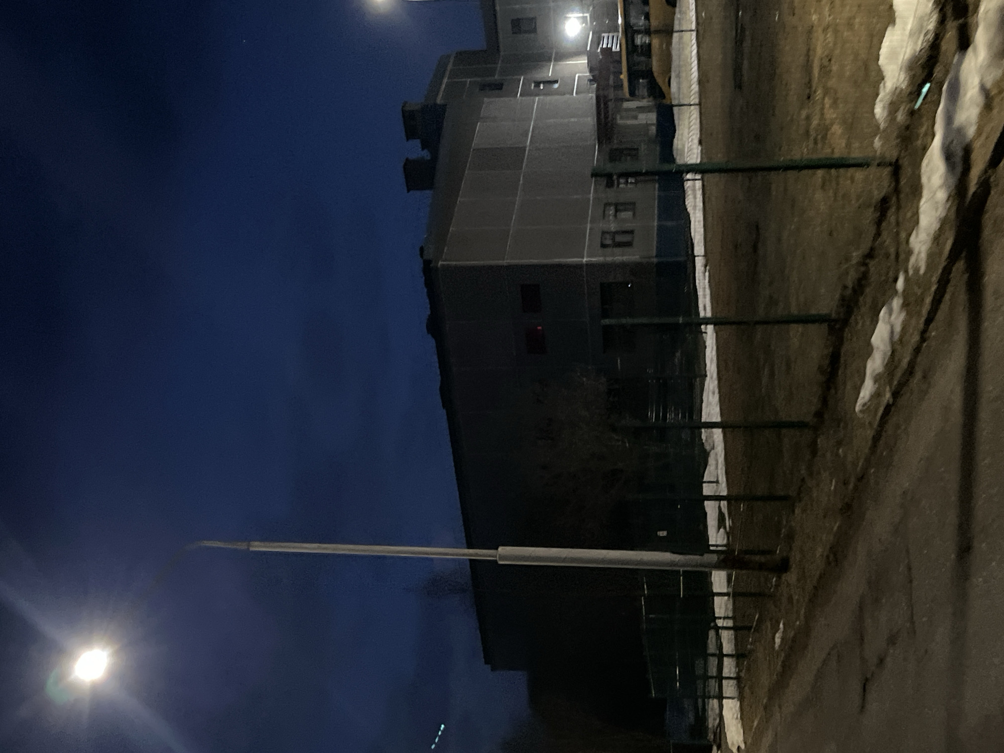 The image depicts a street scene in Markovskii, Russia, at dusk or night. A tall, modern apartment building dominates the view. A row of green metal fences runs along the side of the building. A street light illuminates the scene. The sky is a deep blue. There is snow on the ground. A sidewalk is visible.