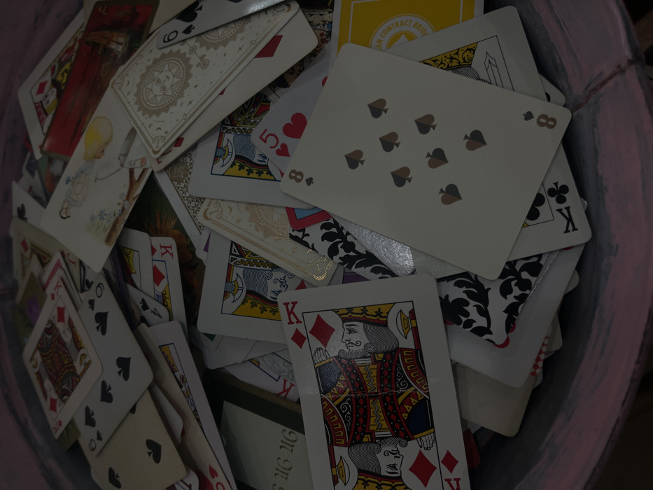 A chaotic pile of playing cards fills the frame, seemingly scattered at random
