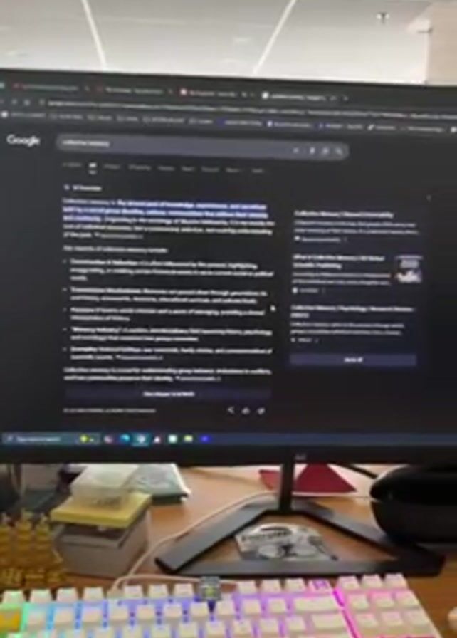 computer desk with a monitor displaying a Google search for "collective memory