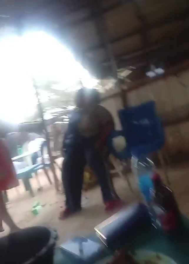view from under a tin roofed structure, likely a restaurant or bar. In the foreground, a table holds a black bucket, a phone, and a plate of food. Beyond the table, several people are visible. One person in a colorful dress is standing. Another person, wearing dark pants and red shoes, is leaning against a blue plastic chair. In the background, there is a table with seated people, all of whom appear to be male and dressed in white. The outdoor setting consists of a sandy ground with trees visible through the openings in the structure. The video is somewhat shaky and blurry.