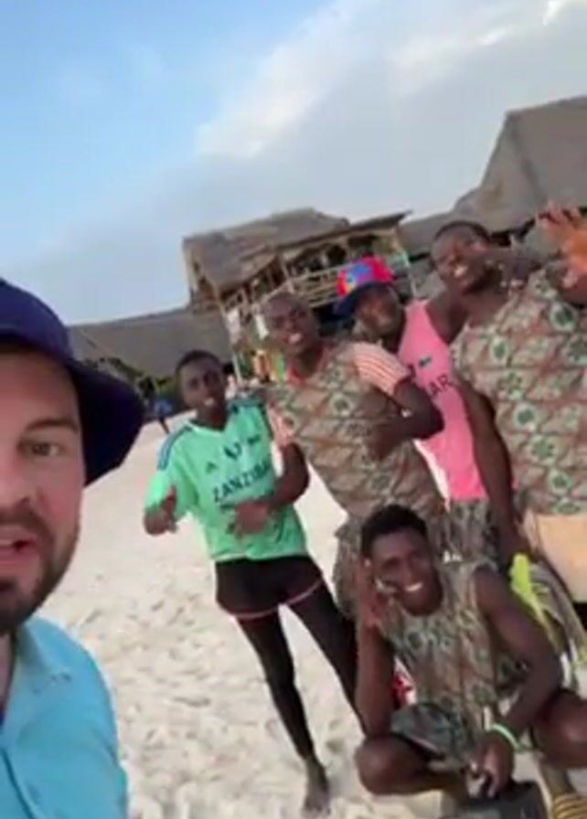 The video features a man recording a selfie video on a beach with a group of six men. The man in the foreground is white, wearing a blue polo shirt and a blue hat. He’s holding the camera and filming himself with the group. The group behind him are Black and dressed in various casual outfits, including a green soccer jersey that says "Zanzibar," a pink tank top that says "Kibar," and several wearing brown and green patterned tank tops. The men are smiling and posing for the camera, throwing peace signs, pointing, and raising their fists. The background shows a white sandy beach, a wooden structure with a thatched roof that appears to be a beach bar or restaurant, and a clear, light blue sky. The overall tone of the video is joyful and celebratory.