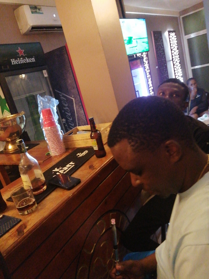 Inside a bar, a man in a white shirt holds a vaping device