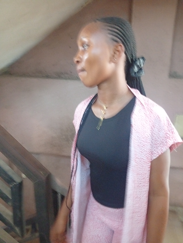 A female individual is depicted standing in profile, facing left, within a semi-enclosed structure in Fegge, Nigeria. She has dark skin and braided hair styled in cornrows pulled back, with some braids resting on her right shoulder, secured by a dark hair tie. She is wearing a black fitted top, an open light pink and white patterned short-sleeved cardigan, and what appears to be matching patterned bottoms. A golden necklace with a rectangular pendant and an adjacent smaller pendant is worn around her neck. A small earring is visible on her right earlobe. To the left, a dark metal railing of a staircase or banister is present. The background consists of a plain, light brown wall with a diagonal structural element or shadow visible in the upper left. The lighting is ambient and diffused.