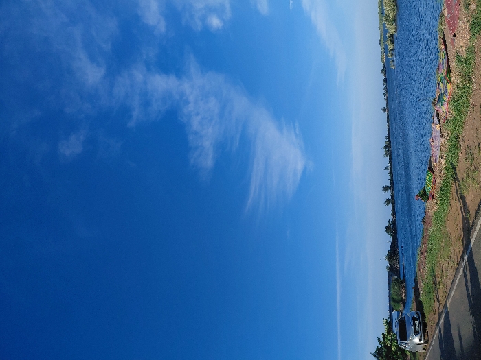 The image depicts an outdoor daytime scene in Banda Aceh, Indonesia, featuring a body of water adjacent to a road under a predominantly clear blue sky. The upper two-thirds of the frame consists of a deep blue sky with wispy, cirrus-like white clouds concentrated in the upper-right quadrant. The lower third of the image is dominated by a wide, calm expanse of dark blue water, which reflects the sky. Along the immediate left edge of the water, a reddish-brown dirt bank with patches of green grass is present. On this bank, several rectangular objects, appearing to be colorful mats or tarpaulins in shades of green, purple, and yellow, are laid flat along the waterline. To the left of the dirt bank, a paved road runs, on which a silver four-door sedan is parked. The vehicle is positioned with its rear visible, facing away from the camera, on the left side of the road. The distant shoreline across the body of water is marked by a horizontal line of small, dark green trees or bushes. No individuals are visible in the scene.