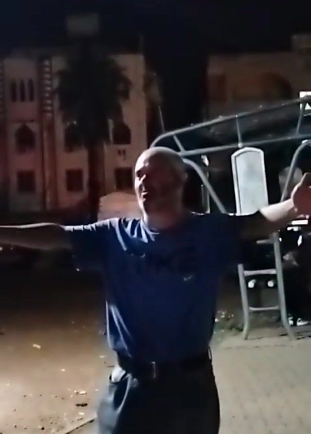 fair-skinned, bald man with a beard wearing a blue t-shirt and jeans, standing in a public area at night. He has his arms outstretched to the sides. The background shows a building with multiple windows, a palm tree, and what appears to be a metal playground structure. Another person wearing a red jacket walks behind the man in the blue shirt. The audio seems to include music with Spanish vocals.