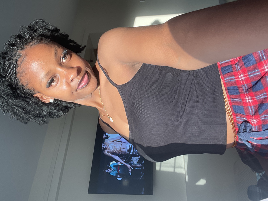 A young woman poses in sunlight wearing a black tank top and red and blue plaid shorts. She has dark, braided hair and is accessorized with a gold necklace and beaded waist chain. Behind her is a television displaying images of people, and light streams in through a nearby window. The camera angle is tilted.