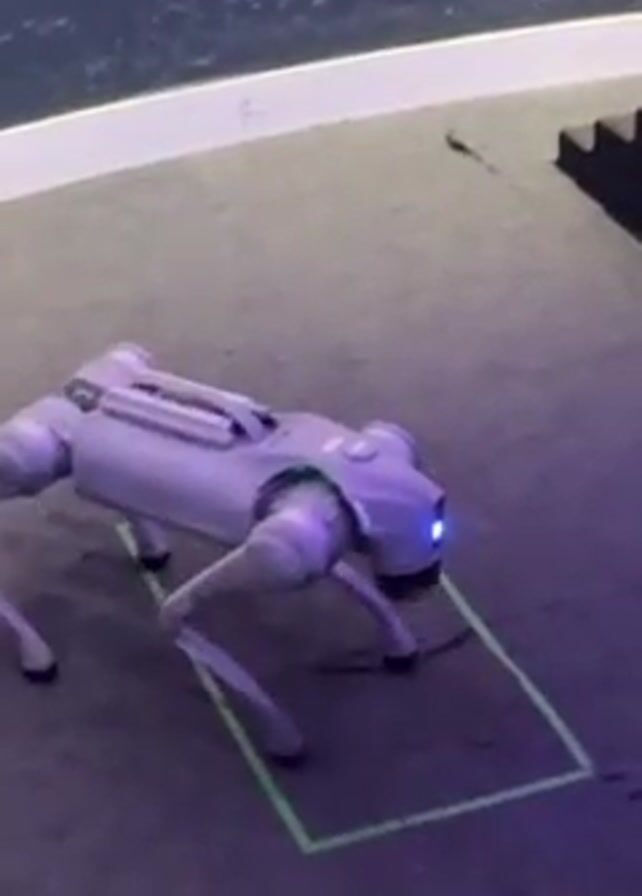 A gray, four-legged robot is standing inside a green square painted on a gray surface. The robot has a blue light on its front and a green light on its back. The robot is moving its legs, but not moving forward. There is a white curved border visible, and a dark object to the right of the square. The background is blurry.