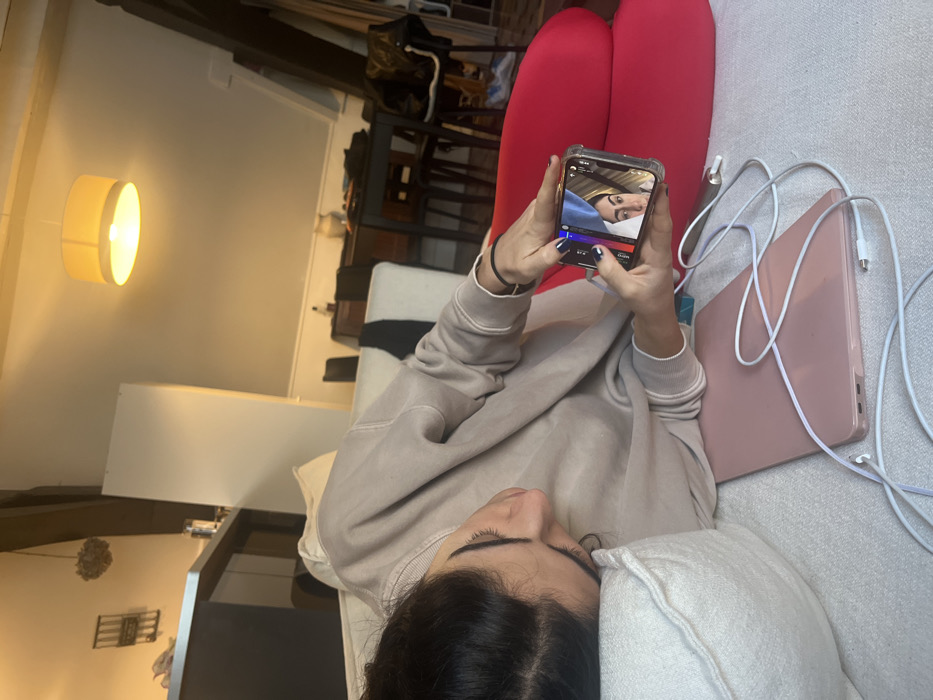 The image depicts an indoor scene within a residence in Paris, France. A female individual is shown lying on her left side on a light-colored sofa, with her head resting on a white cushion. She wears a light beige long-sleeved sweatshirt and red pants. Her hands hold a smartphone horizontally, and she is actively observing its screen; her left thumbnail is painted dark blue. The phone's display shows a partial close-up of another person's face, featuring dark eyebrows, dark eyes, and a head covering, set against a background split into blue and white sections. Adjacent to the female on the sofa is a closed pink laptop. White charging cables and white wired earbuds are tangled on the laptop and sofa. A dark silver portable charger is also visible near her right hand. The room features an architectural design with a sloped, light-colored ceiling traversed by exposed dark wooden beams. A yellow drum-shaped pendant light fixture is centrally positioned on the ceiling. In the background, a modern kitchen counter or bar area is visible to the left, while a dark wooden dining table with chairs and a credenza displaying a white vase are present to the right.