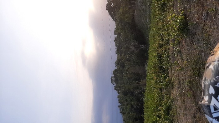 The image depicts an outdoor landscape scene, likely at dawn or dusk, within the city of Lhokseumawe, Indonesia. The upper half of the frame shows a sky transitioning from a pale blue to bright white, with a strong glare from the sun positioned towards the upper right. Darker, streaky clouds are present towards the left, and faint horizontal lines, indicative of power lines or utility cables, traverse the mid-upper sky. Below the sky, a dense line of dark green tropical trees forms a natural horizon, suggesting a forested area or a hill covered with vegetation. Beyond these trees, a body of water, consistent with the Malacca Strait, is visible, reflecting sunlight in a textured, wavy pattern under the cloudy sky. The foreground consists of an agricultural field or open ground characterized by dry, light brown soil with numerous patches of low-lying green vegetation, likely young plants or crops. The ground appears uneven, with various small plants scattered across it. In the extreme bottom-left corner, a partial, out-of-focus object is visible. This object displays a black, white, and grey pattern, incorporating designs such as stars, hearts, and text fragments, consistent with a personal item like a helmet or a bag. No people are visible within the scene, and no specific actions or interactions are depicted. The environment suggests a rural or semi-rural area transitioning into a coastal landscape.