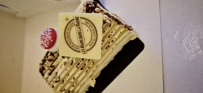 A close-up shot features a dessert, likely a mille-feuille, topped with a white chocolate square. The square has the inscription "LES MAINS DANS LA FARINE" and other bakery-related French phrases in a circular design. A red, round object, covered in tiny white spheres, sits near the chocolate square, possibly a decorative element. The dessert itself has layers of cream or custard, sprinkled with brown flecks. A dark-colored, possibly chocolate, base is visible beneath the layers. The image is set against a white or light-colored background.