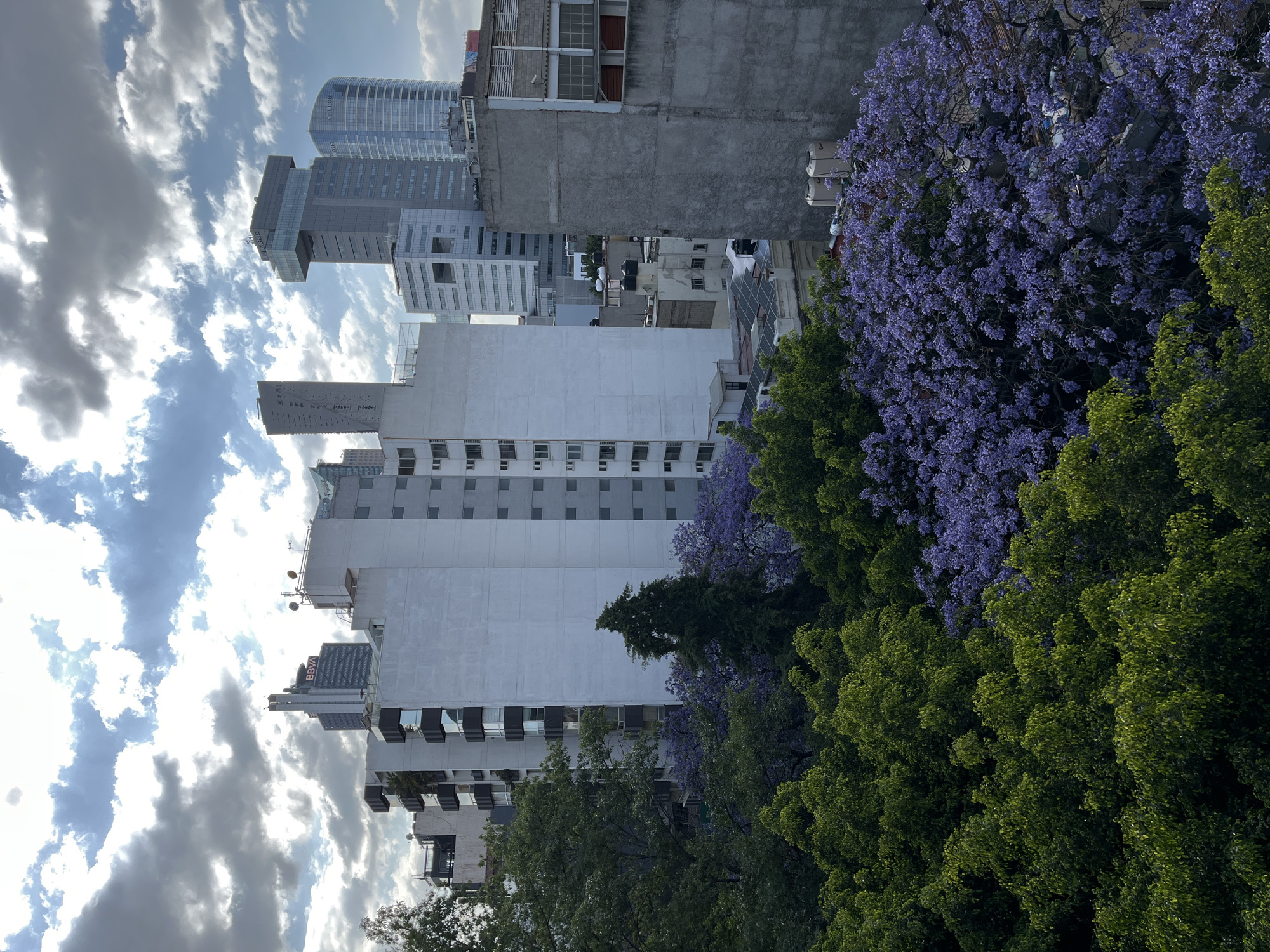 view of Mexico City, Mexico, featuring a combination of modern skyscrapers, older concrete buildings, and lush green trees with vibrant purple blossoms
