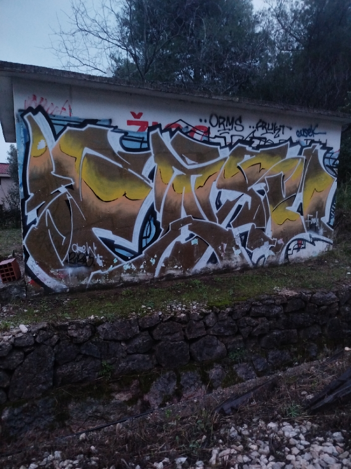 A concrete structure stands against a backdrop of trees. The wall is covered in colorful graffiti art. A stone wall rests below the structure. The ground in front has grass. Beyond that is gravel. Overcast lighting gives the scene a muted tone.