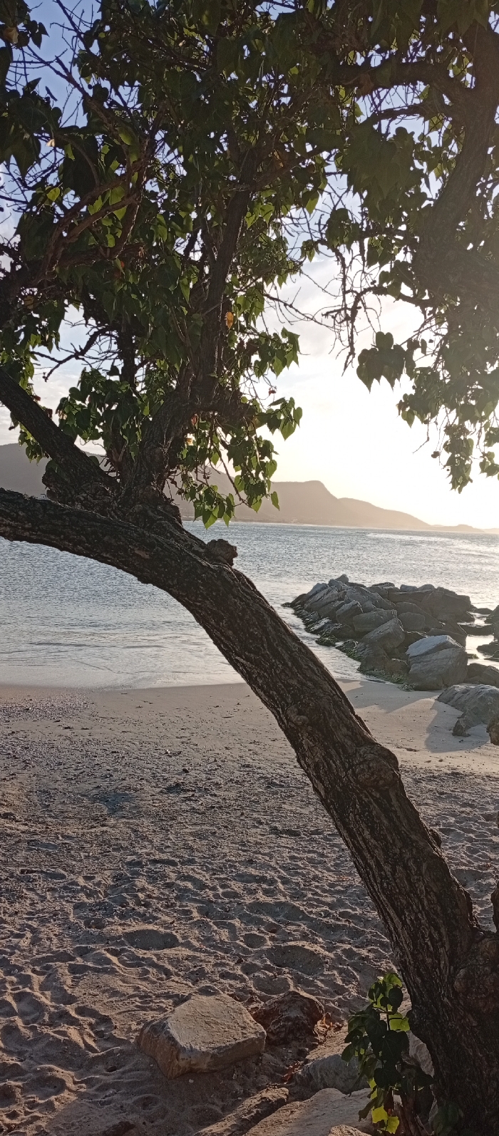 The image depicts a coastal scene in Juan Griego, Venezuela, viewed from a sandy beach at what appears to be either sunrise or sunset, with strong backlighting. A substantial tree with a thick, dark, textured trunk leans diagonally from the lower left foreground, extending upwards and to the right. Its branches, covered with green leaves, fill the upper left and central portions of the frame. The sandy ground shows footprints and small scattered marine debris. In the mid-ground, calm, light blue-grey ocean water meets the shore, with a visible line of grey boulders forming a breakwater extending from the right into the water. Distant hills or mountains are silhouetted against a bright horizon under a pale blue sky with minimal cloud cover. No individuals or active subjects are present.