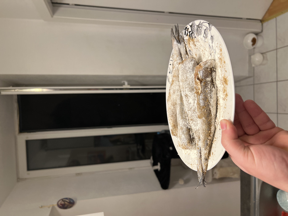 - "A person's hand holds an oval plate of breaded, slender fish, likely smelt or similar, in a kitchen" by FM-2ffbq1, licensed under CC BY 4.0