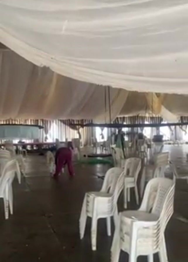 interior of a large tent, likely used for events. The tent is draped with white fabric, creating a flowing ceiling effect, with some tan and maroon fabric accents visible near the top of the frame. The floor is a dark, slightly shiny surface with noticeable stains and dirt. Numerous white plastic chairs are stacked in various spots across the space. A person wearing pink pants is visible in the background, bending over and apparently cleaning the floor. There are tables visible in the background. The scene appears to be a post-event cleanup.
