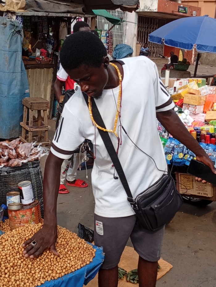 In an outdoor market, a man in a white shirt with black stripes and gray shorts is examining a pile of yellowish seeds, possibly beans or nuts, displayed on a blue tarp. He wears a black crossbody bag, a beaded necklace, and has a ring on his finger. The market backdrop includes various goods, stalls, and people, under a mix of daylight and shade.