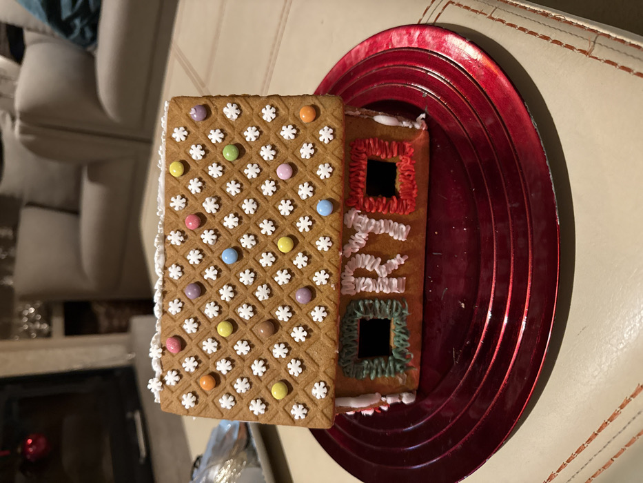 A gingerbread house rests on a red plate