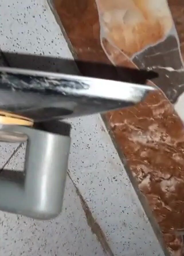 A handheld camera focuses on a gray and silver Philips iron with a yellow dial on a speckled white floor, with a section of brown and beige tiled floor visible on the right