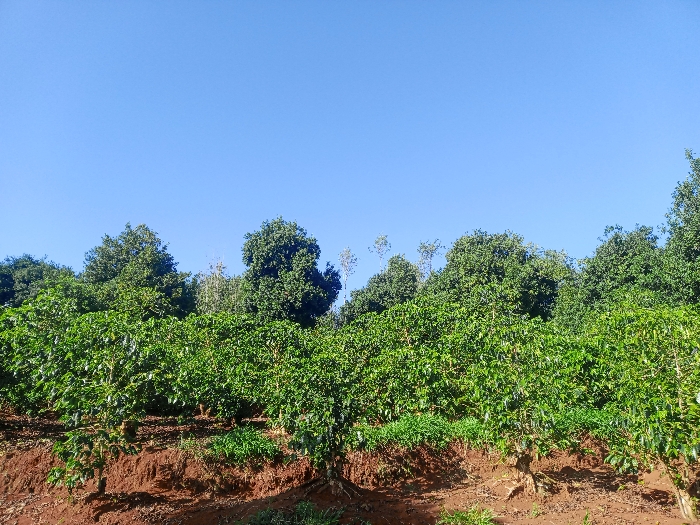 The image displays an outdoor scene in Karuri, Kenya, characterized by an agricultural landscape under a clear, light blue sky. The lower two-thirds of the frame are dominated by rows of healthy, dense green coffee plants, cultivated on reddish-brown soil. The soil surface is partially exposed, revealing variations in terrain between the plants. Behind the coffee plants, a continuous line of taller, dark green trees forms a background canopy. A few lighter-colored trees with sparser foliage are interspersed within this background treeline. No human figures, animals, or artificial objects are present. The environment is illuminated by direct sunlight.