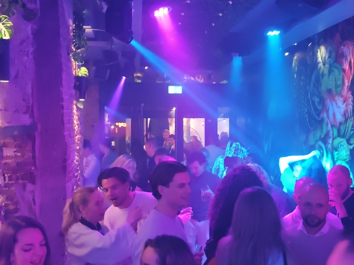 The image depicts an indoor social gathering, consistent with a nightclub or bar environment