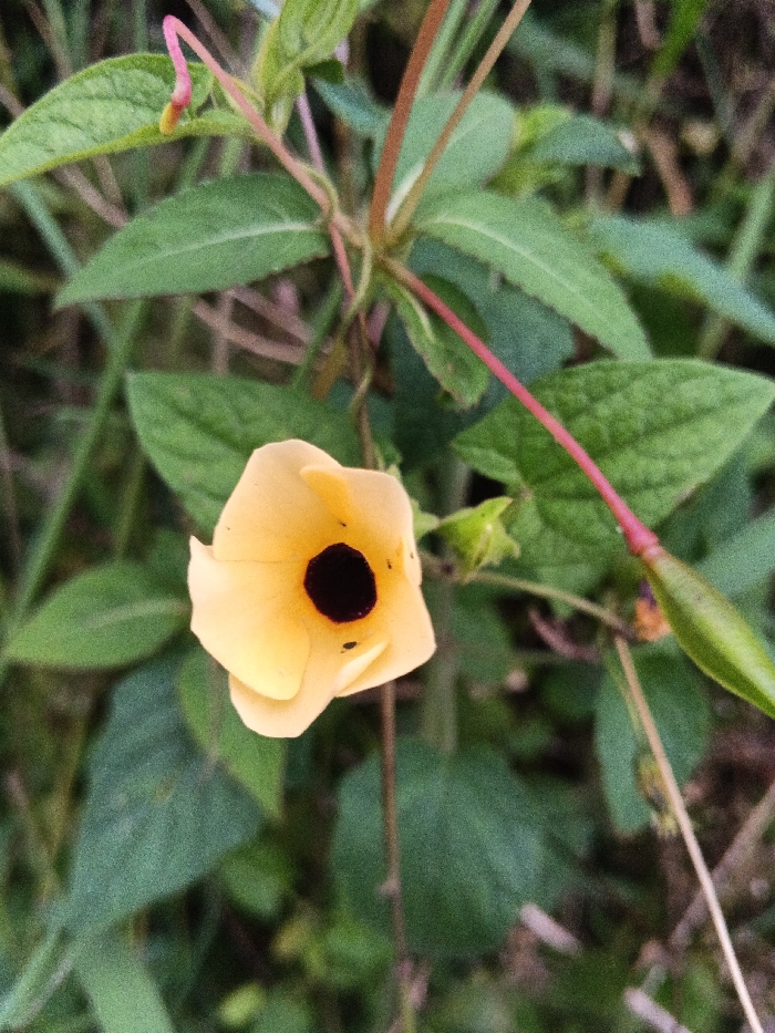 A close-up view captures a single yellow flower with a distinct dark brown to black central disc, positioned within dense green foliage in Pinnwe, Myanmar (Burma). The flower presents five visible pale yellow petals, some exhibiting small dark specks near the center. Surrounding the blossom are numerous green leaves of varying textures and several slender stems, some displaying a reddish-pink hue. To the immediate right of the flower, a long, light green pod-like structure is visible, extending diagonally from a reddish stem. The background consists of blurred green vegetation, indicating a natural, outdoor environment. No human subjects or interactions are present.