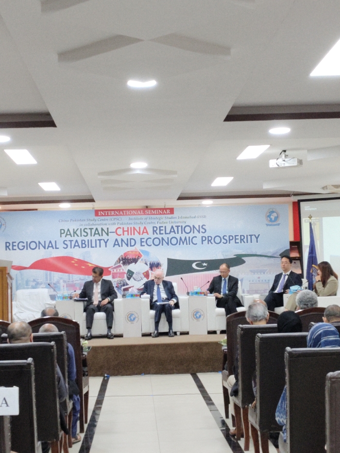 The image depicts an indoor international seminar in Blue Area, Pakistan