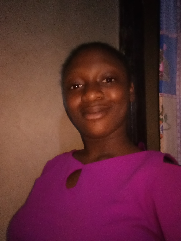 A young, dark-skinned woman smiles slightly at the camera. She wears a magenta top with a small keyhole detail at the neckline. Her dark hair is pulled back from her face. The background is dimly lit, with a light beige wall on the left and what appears to be a dark doorframe and a patterned curtain on the right. An earring is visible hanging from her left ear.