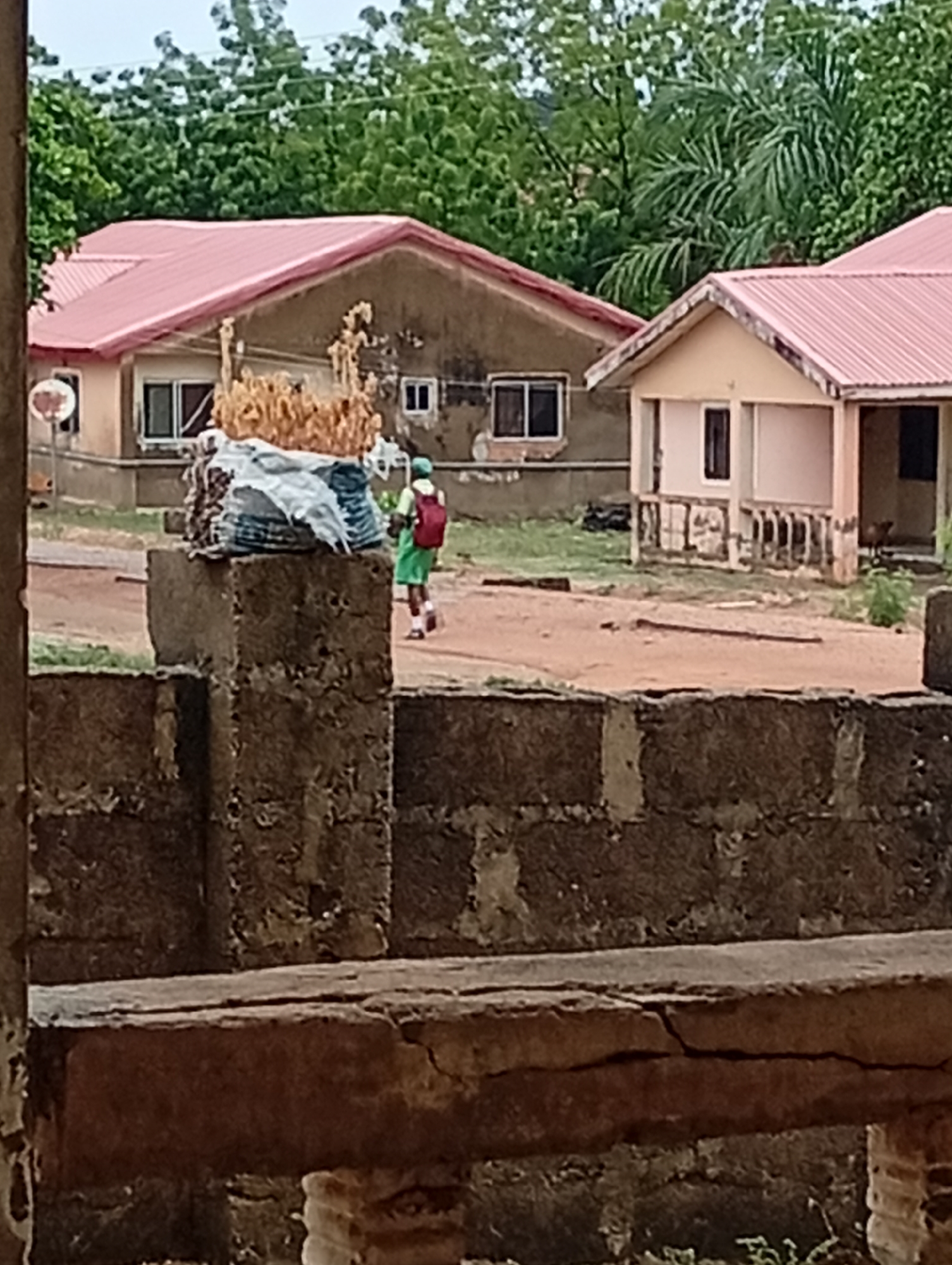 The image depicts a residential scene in an unknown location. In the midground, there are two single-story houses with pink roofs. The house on the left is light brown with two windows and a pile of cornstalks and a white/blue bag on a column in front of it. The house on the right is a beige color, also with a pink roof, supported by columns. A person wearing green clothing and a red backpack is walking on a dirt road between the buildings. In the foreground, there is a low, unfinished concrete wall, which is cracked and worn. The background consists of green trees and foliage. The lighting is somewhat overcast, suggesting it may be early morning or late afternoon. The scene appears to be in a rural or semi-rural location.