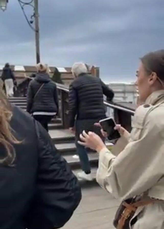 group of people walking up a set of stairs on a bridge, presumably in Venice, Italy. The focus is on a woman in a tan trench coat who is gesturing and talking. Other people are ahead of her on the stairs, including a woman in a black puffer jacket and leggings, and a man in a similar black jacket and jeans. The sky is overcast. The railing of the bridge is wooden, and you can see colorful buildings in the background.