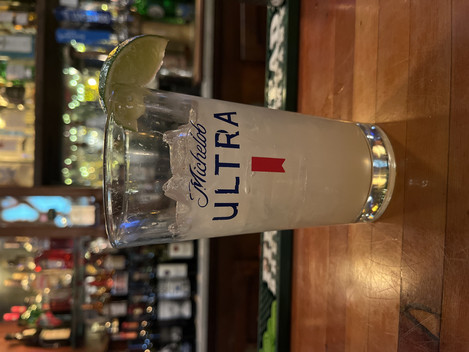 A Michelob Ultra-branded glass, filled with a light-colored beverage and ice, is garnished with a lime wedge on the rim. It sits on a wooden surface, likely a bar top, with a green and white patterned edge visible nearby. In the blurred background, a variety of bottles are displayed on shelves, suggesting a bar or restaurant setting. The lighting is soft and creates a warm, inviting atmosphere.