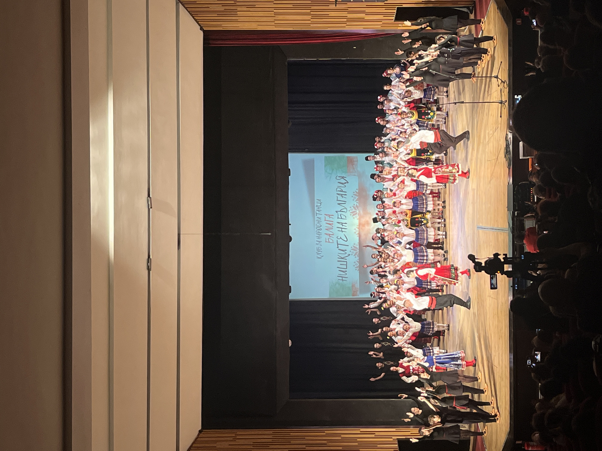 stage performance by a folk dance group. The dancers are arranged in rows, wearing traditional Bulgarian costumes with white, red, blue, and black colors. They are waving to the audience. Behind them, a screen displays Bulgarian text. The image is taken from the audience's perspective, with the heads of the audience visible on the sides. The venue appears to be a theater or auditorium with wooden paneling and lighting. The location is indicated by the text on the screen as Nova Zagora, Bulgaria.