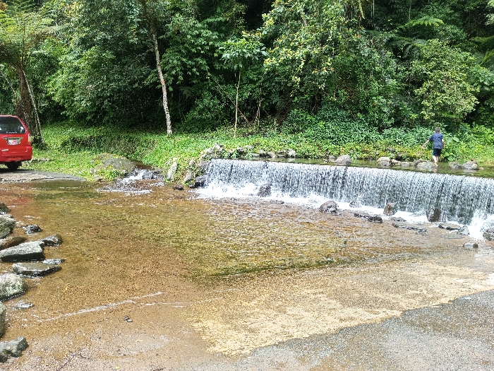 The scene depicts a natural outdoor environment modified by human activity, with no specific visual identifiers for the city of Kanand, India. A stream flows horizontally across the midground and foreground, featuring a constructed concrete weir creating a small waterfall. The water below the weir is shallow and clear, revealing a light brown sandy and gravelly bed. Above the weir, stepping stones are visible in the shallow water. On the right side, a single individual, viewed from the back, wearing a dark t-shirt and dark shorts, is wading barefoot in the shallow water immediately upstream from the weir. On the left side, the rear portion of a red minivan or SUV is parked on an unpaved dirt track adjacent to the stream. The background consists of dense, lush green tropical foliage, including numerous trees and thick undergrowth. The immediate foreground comprises wet, light-colored ground, transitioning to a dark paved surface on the far right.