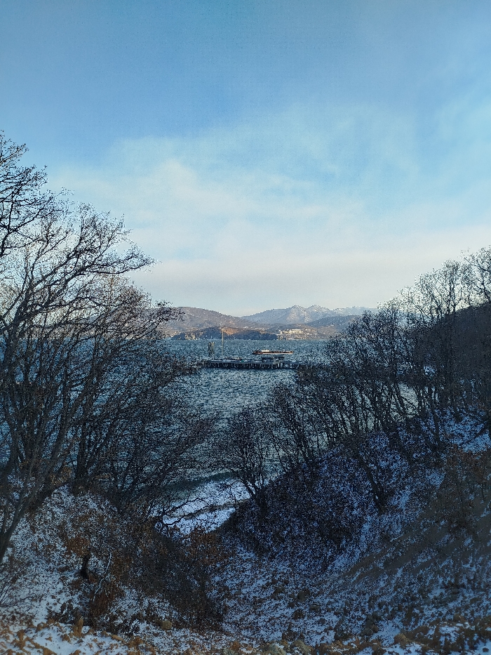 The image presents a winter scene with a body of water, possibly a bay or a lake, framed by bare trees and snow-covered ground. In the distance, a pier or dock extends into the water. Mountains are visible on the horizon beneath a blue sky with light cloud cover. The foreground shows a slope covered in snow and dry vegetation. The composition is serene, emphasizing the stillness and coldness of the winter landscape.