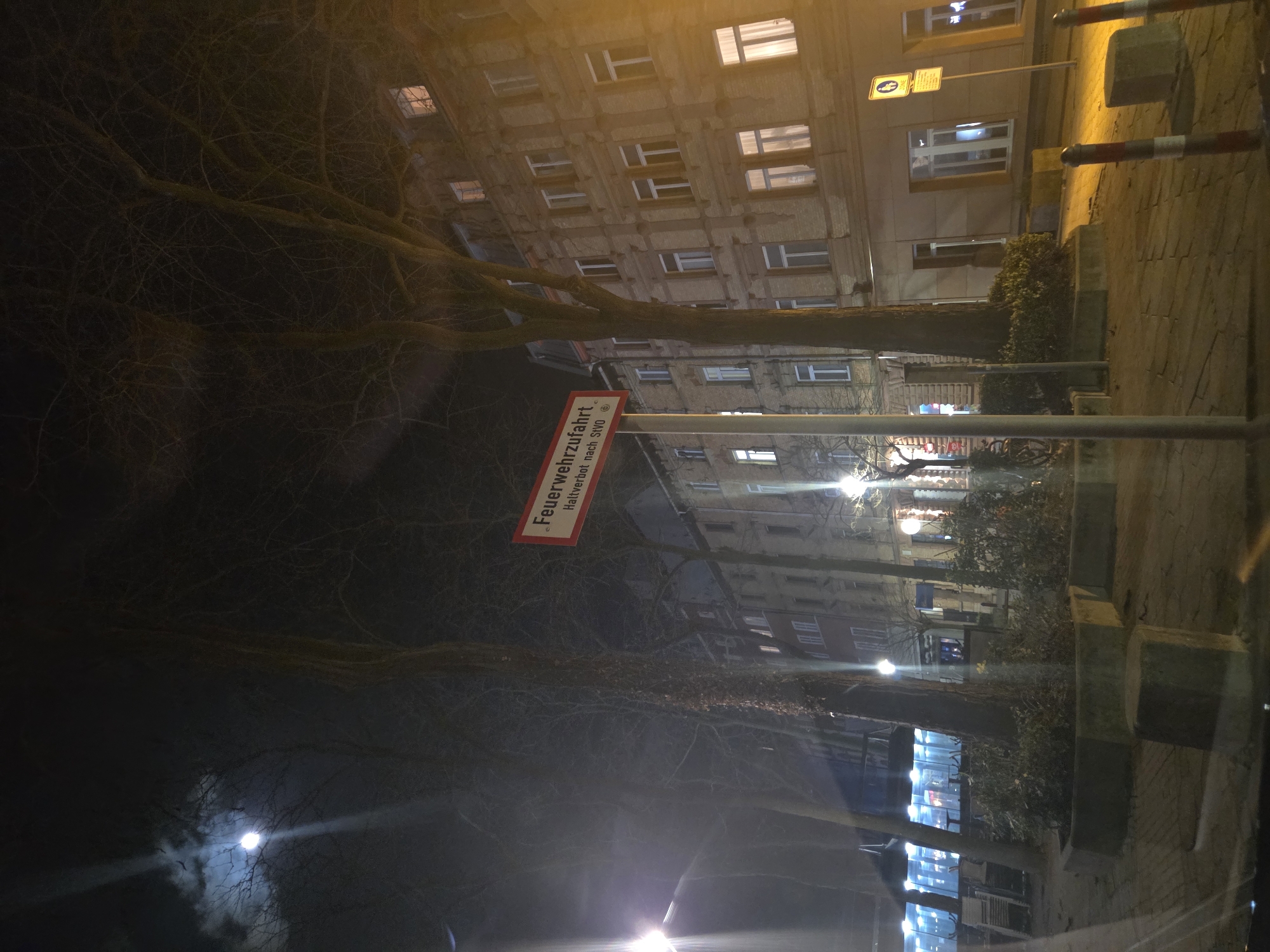 The image depicts a street scene in Ludwigshafen am Rhein, Germany, at night. A "Feuerwehreinfahrt Halteverbot" (Fire Department Entrance No Parking) sign is prominently displayed. Behind the sign, a multi-story building with illuminated windows is visible. Bare trees line the street. A streetlight illuminates the area. A sidewalk and curb are visible on the right side of the frame.