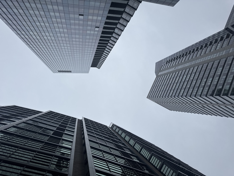 - "The image presents a worm's-eye view of a modern urban environment, capturing the upper sections of three high-rise buildings against an overcast, light grey sky" by FM-NA92I2, licensed under CC BY 4.0