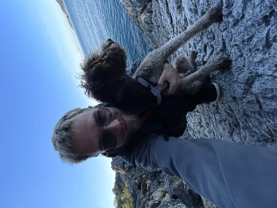 A male individual and a dog are positioned on a rocky coastline in Pržno, Montenegro. The man, with blond spiky hair and a beard, wears dark aviator-style sunglasses, a dark hooded jacket over a red garment, and grey sweatpants. He is in a crouched posture, holding a medium-sized dog with curly brown and grayish fur, which wears a grey harness. The man is smiling directly towards the camera, while the dog looks to the right side of the frame. The immediate environment consists of light-colored, uneven rock formations. In the background, calm blue sea extends to the horizon, with a distant landmass covered in green vegetation visible on the right, all under a clear blue sky.