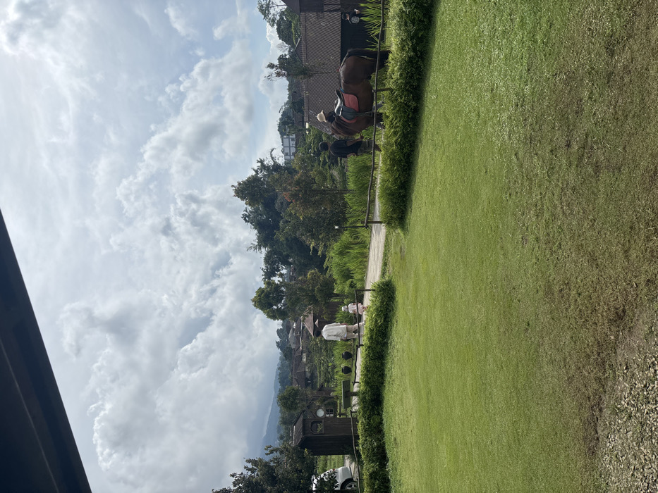 A landscape scene shows a grassy area adjacent to a path. A horse stands near a hedge with a person attending to it. In the distance, there are buildings amidst trees. The sky is overcast with prominent clouds. A small wooden structure is visible in the foreground near a parked car.