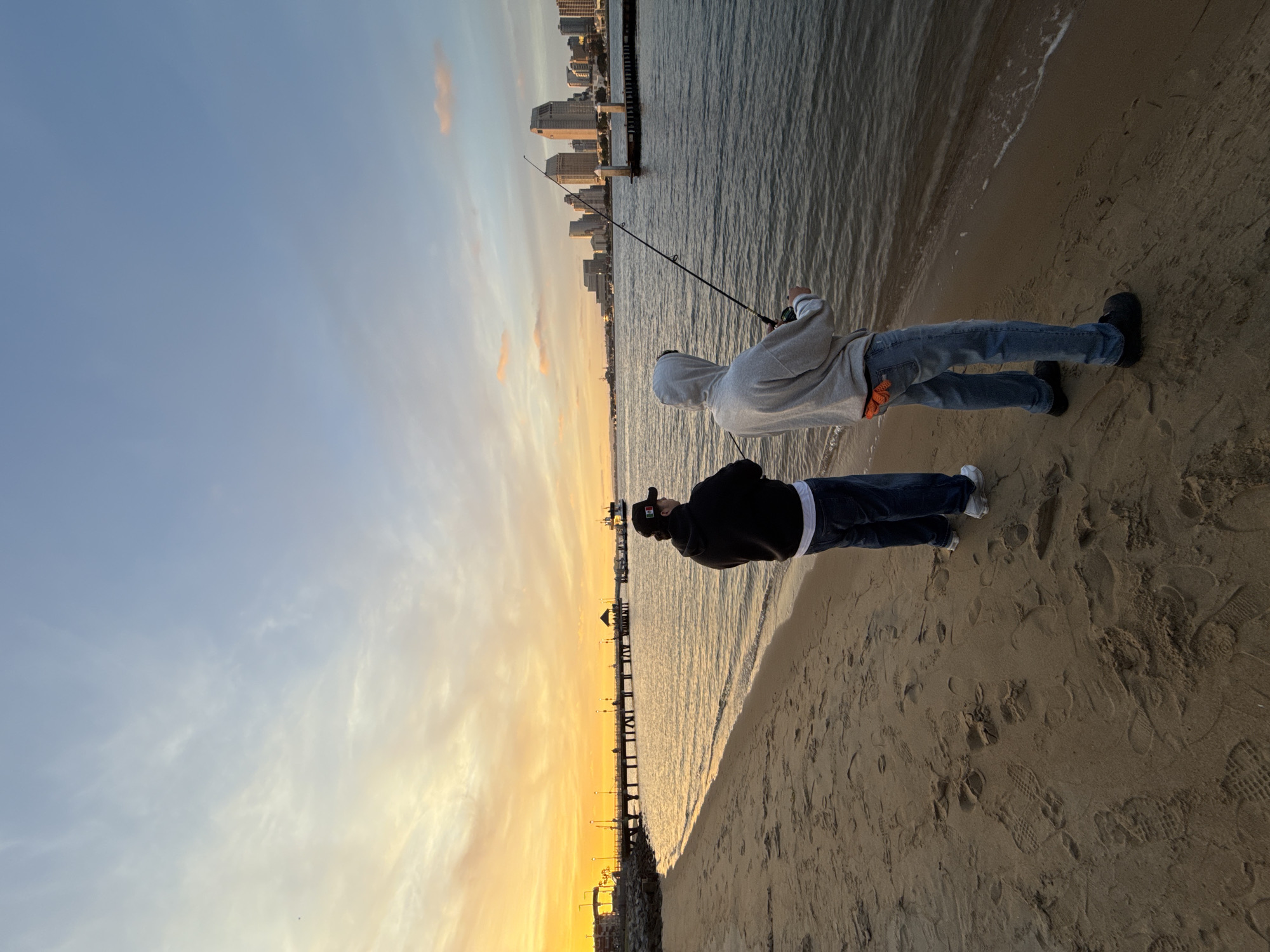 Two individuals are on a beach at sunset. One individual is fishing in the water. The location appears to be near the Coronado Ferry Landing, which is recognizable by the pier and the San Diego skyline across the bay. The beach is sandy with footprints. One individual is wearing a light gray hoodie and jeans. The other individual is wearing a black hoodie and jeans.
