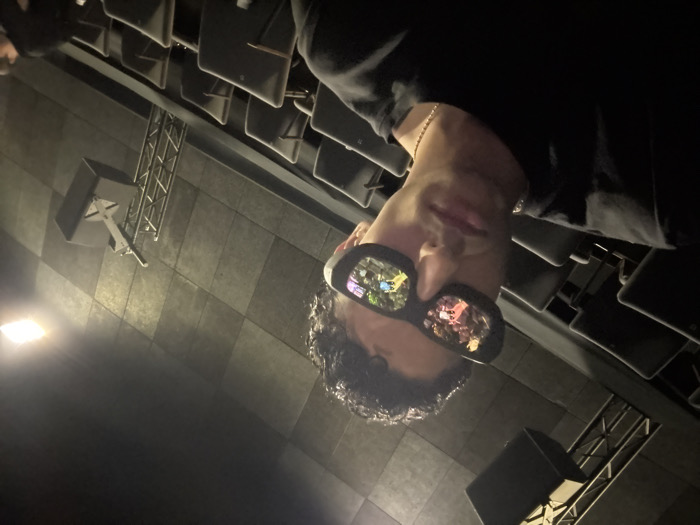 An individual wearing sunglasses, with their reflection showing a crowded venue, is pictured in a dimly lit room. Rows of dark seats, likely in a theater or auditorium, are visible in the background. A lighting fixture is also present in the background. The person is positioned at an odd angle, and their face is the main subject of the shot. They wear a dark-colored shirt or jacket, and a gold chain is around their neck. The overall tone is casual and somewhat stylized.