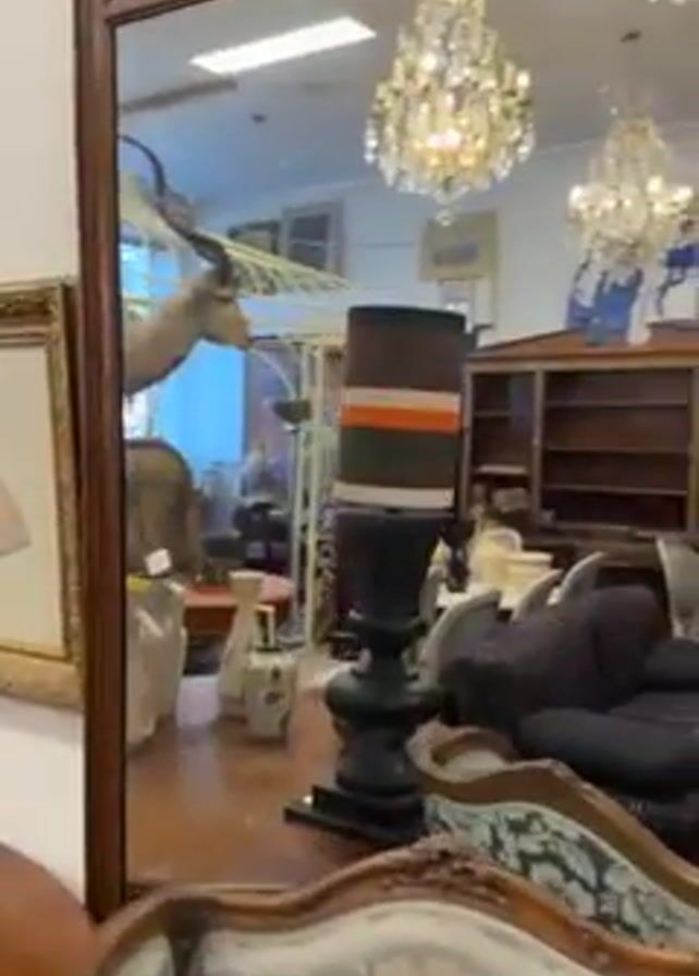 The video presents an interior scene, likely an antique store, displaying a variety of furniture and decorations. A large wooden-framed mirror occupies a significant portion of the view, reflecting the surrounding items, including a chandelier and a woman taking a photo of herself in the mirror. The mirror also reflects parts of the room, showing bookshelves, lamps, and assorted chairs. The camera pans to the right, revealing a taxidermied head of an animal, possibly an antelope or deer, mounted above a decorative cage-like structure. Below the animal head, there is a table with copper pans displayed. The environment is cluttered with various antique items, creating a sense of an eclectic and packed store.