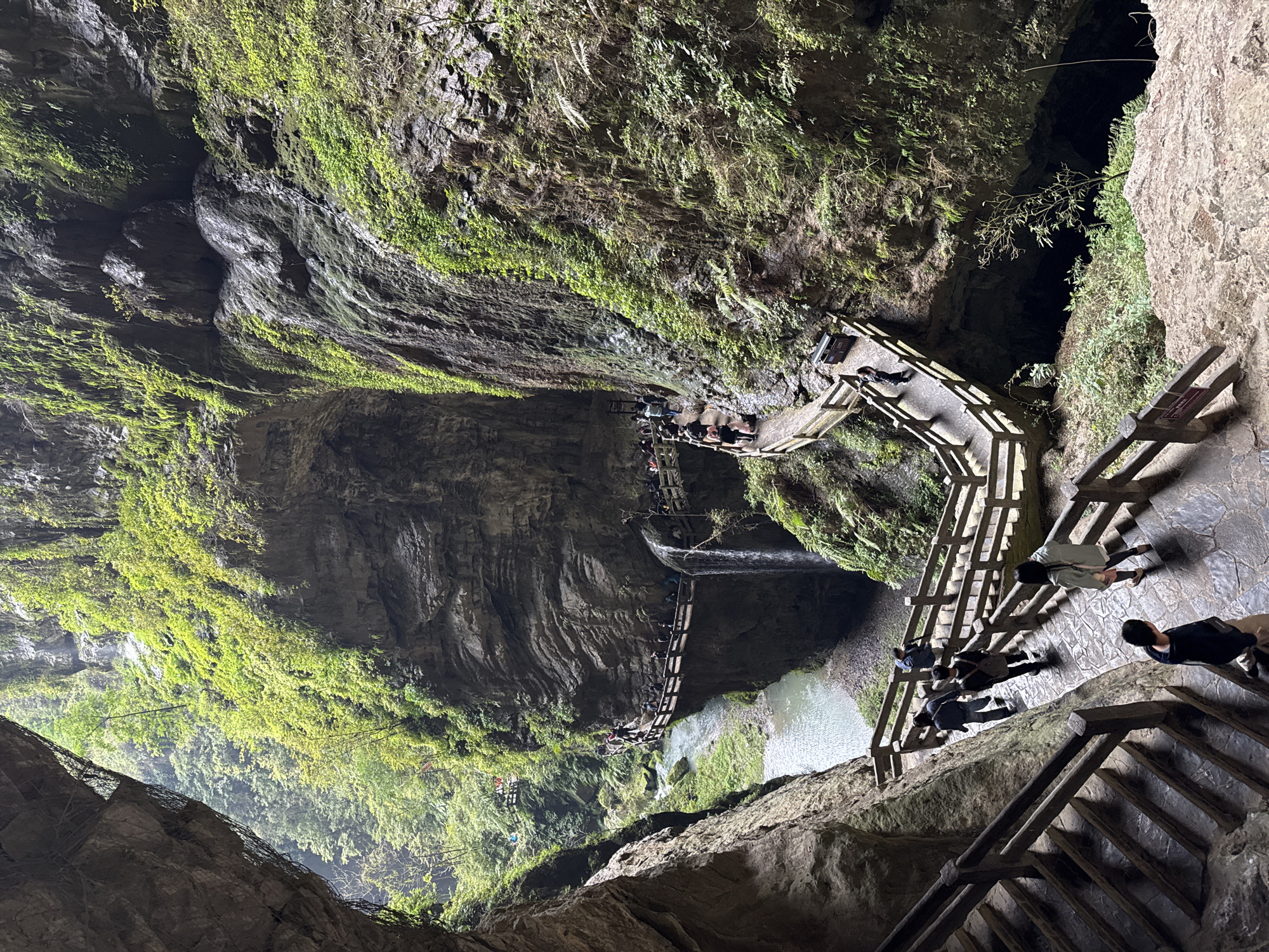 The image depicts a deep, moss-covered gorge or sinkhole in Wulong District, Chongqing, China. A series of wooden walkways and staircases are constructed along the sides of the gorge, facilitating human access and navigation. Several people are visible walking on these pathways. The gorge is characterized by steep, rocky walls with vegetation, particularly moss, clinging to the surfaces. A small stream or river flows at the bottom of the gorge, visible below the walkways. The lighting is dim, creating a dramatic contrast between the shadowed depths and the areas exposed to more ambient light.
